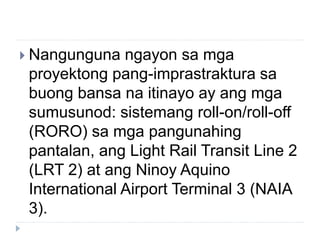 Siya ay kinilala para sa kanyang pangitain at patuloy na pagsisikap na baguhin ang mga pag-iisip tungo sa isang maayos. Programang Pang-imprastraktura Ang imprastraktura ay tumutukoy sa mga estrukturang mahalaga sa pag-unlad ng bansa tulad ng mga kalsada tulay riles ng tren paliparan at daungan ng mga barko. View AP3_Q4_M5_Tagalog_Kahalagahan-ng-Imprastraktura-sa-Kabuhayan-ng-mga-Rehiyondocx from COM MISC at St.